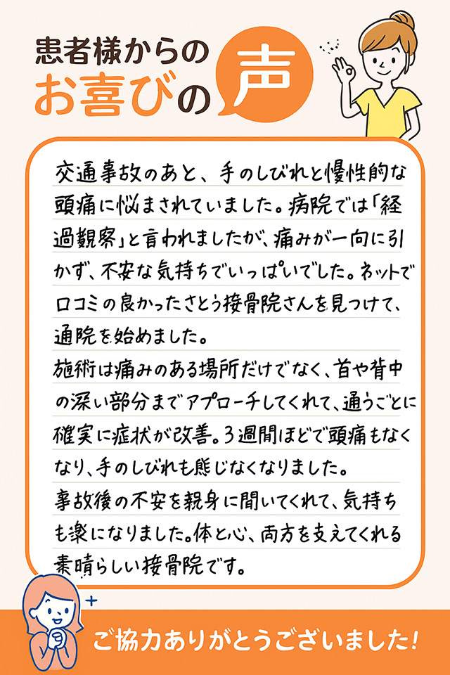 今後の通院、施術の方針などを分かりやすくアドバイスいたします。