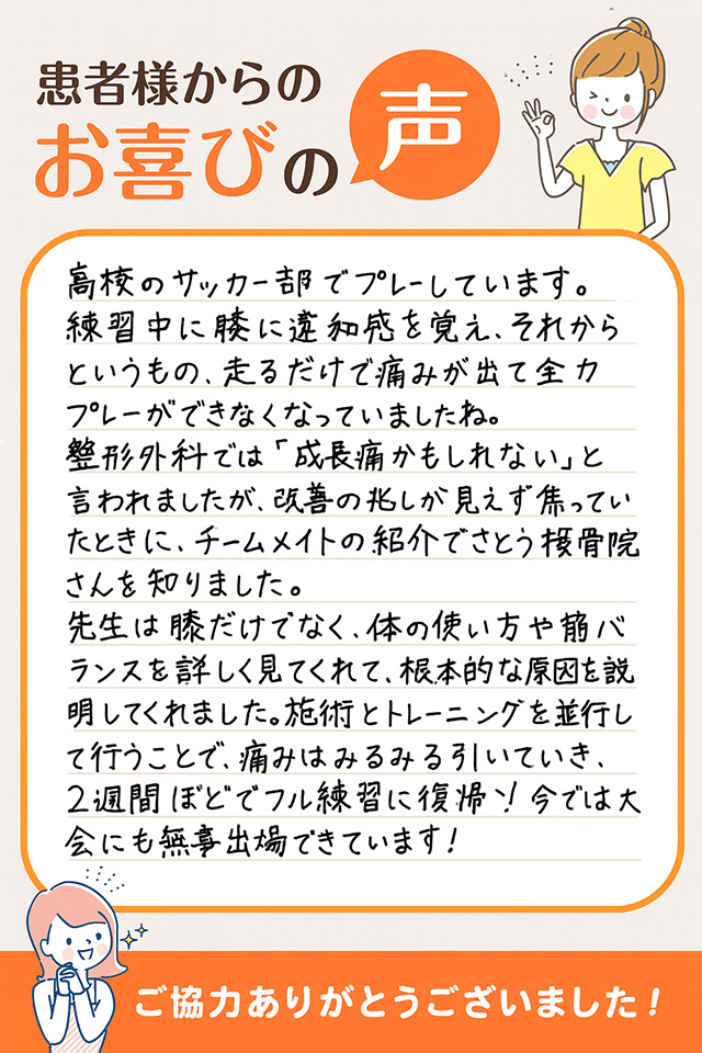 当院では成長期特有の膝の痛み(オスグット・ジャンパーズニー)の症状改善を得意としております。