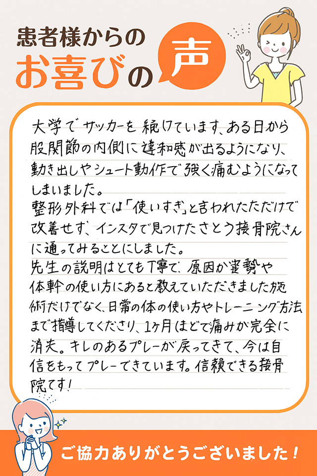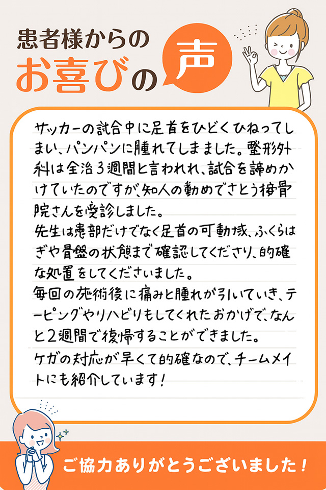 約1ヵ月間、何度も先生のところに通い治療をしてもらい、トレーニングのスケジュールや大会までのスケジュールに合わせてずっと面倒を見てもらい、なんとか大会のピッチに立つ事ができました。